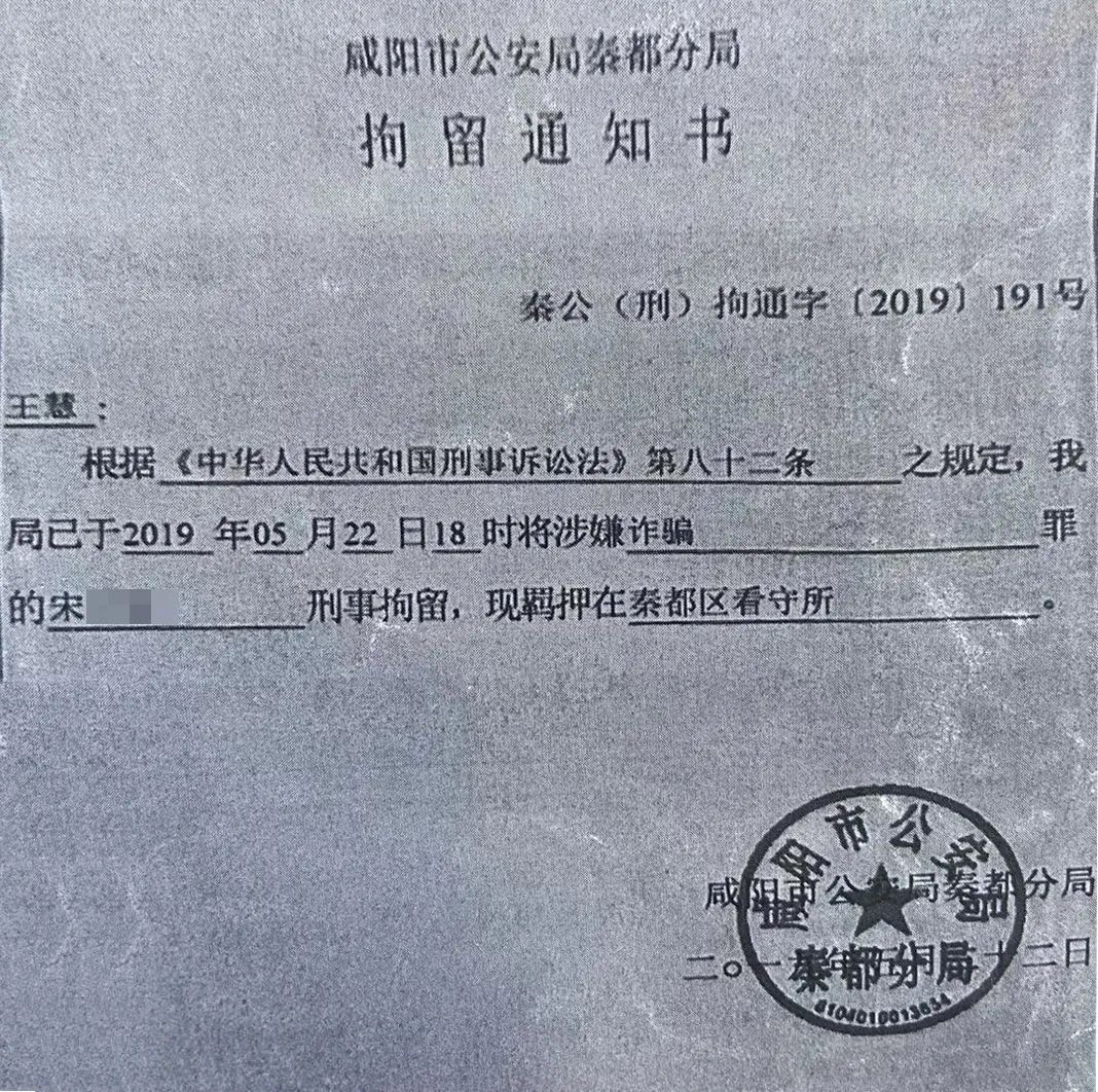 2019年5月22日,宋某某因涉嫌诈骗罪被咸阳市公安局秦都分局刑事拘留,2019年6月12日被依法逮捕,羁押于咸阳市秦都区看守所。